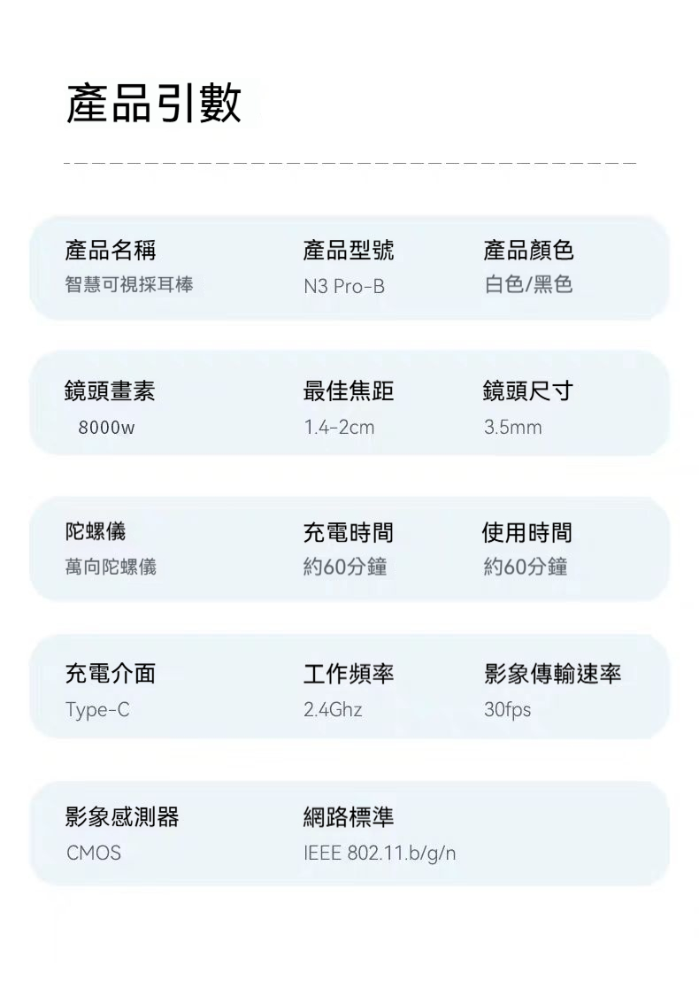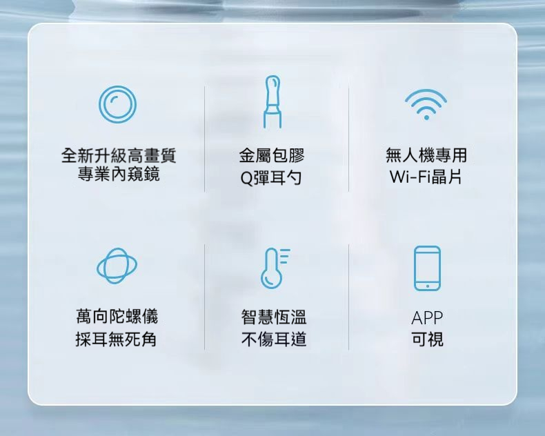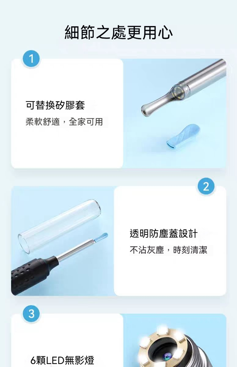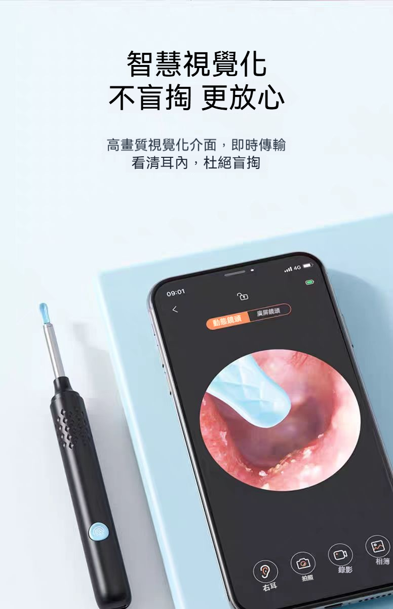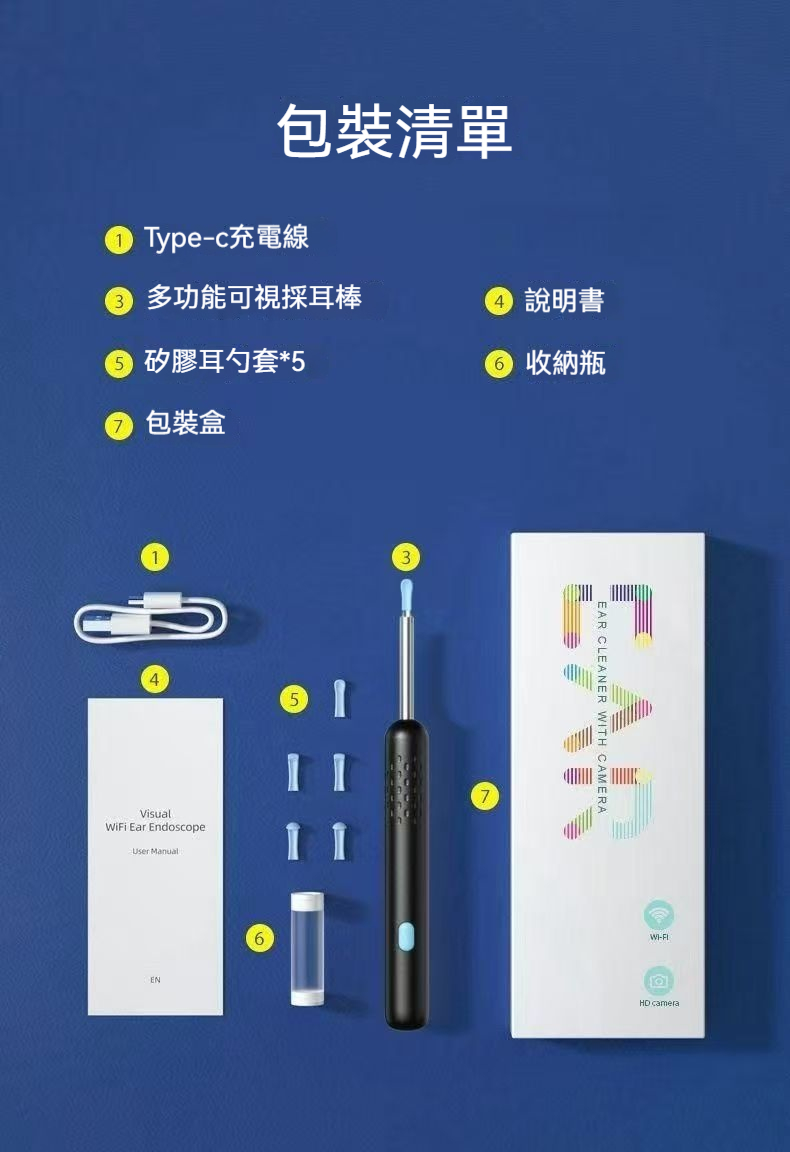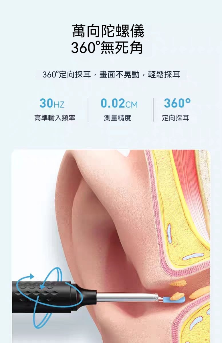 黑科技降臨!把「耳內無人機」開進耳朵裡!360°可視挖耳勺終極體驗✨✅ 【6顆LED無影燈】彷彿自帶攝影棚,耳道一清二楚,無死角! ✅ 【萬向陀螺儀探頭】靈活旋轉,輕鬆避開敏感部位,溫柔不刺痛! ✅ 【Wi-Fi智能連接】手機APP即時觀看,還能錄影分享驚奇瞬間! ✅ 【金屬包膠耳勺】Q彈柔軟,搭配智慧恆溫技術,呵護嬌嫩耳道! ✅ 【全家可用】配備可替換矽膠套,衛生乾淨,大人小孩都能享受!